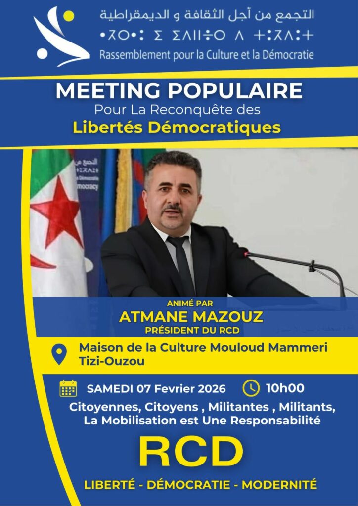 وعليه، أدعوكم إلى المشاركة في التجمع الاحتفالي بمناسبة الذكرى السابعة والثلاثين لتأسيس الحزب، وذلك يوم السبت 70 فيفري 6202 على الساعة العاشرة صباحًا بـدار الثقافة مولود معمري بتيزي وزو.